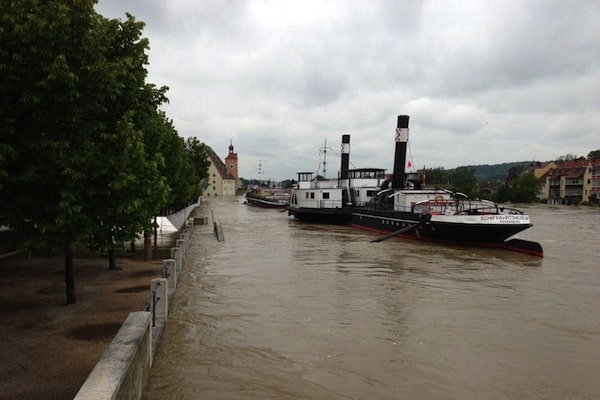 In der Donaustadt Regensburg stand das Wasser am abschüssigen Fußweg zum Wurstkuchl 1,5 Meter hoch. Das Wasser reichte bis zu den Fenstern.